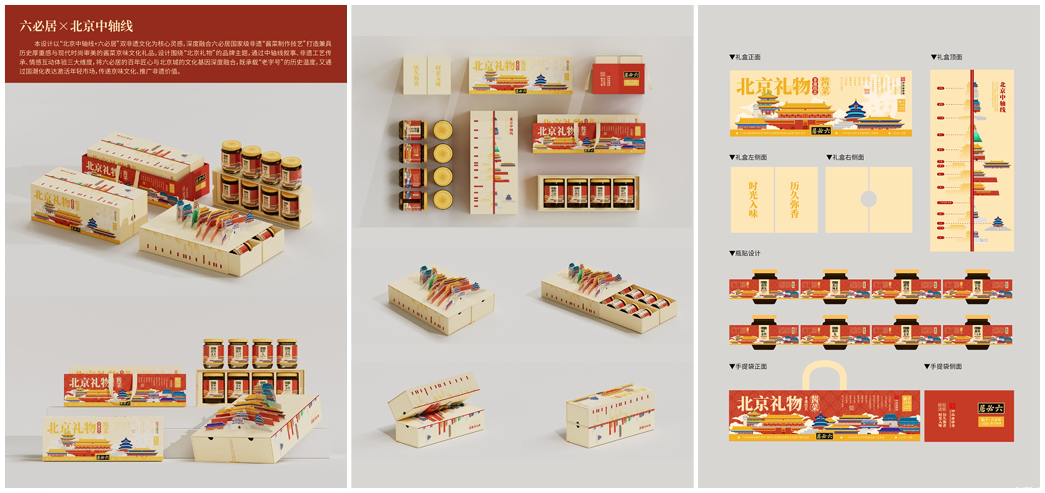唐彬彬的作品受到了评委们的一致高度评价。她巧妙地将代表北京城市核心文脉的“北京中轴线”与拥有近六百年历史的中华老字号“六必居”酱菜制作技艺这两项国家级非物质文化遗产进行创新性链接与融合。设计出的礼盒包装,不仅展现了深厚的历史文化底蕴,更通过创新的视觉语言、精良的工艺构想和极高的艺术完成度,实现了传统非遗文化与现代设计美学的精彩对话。